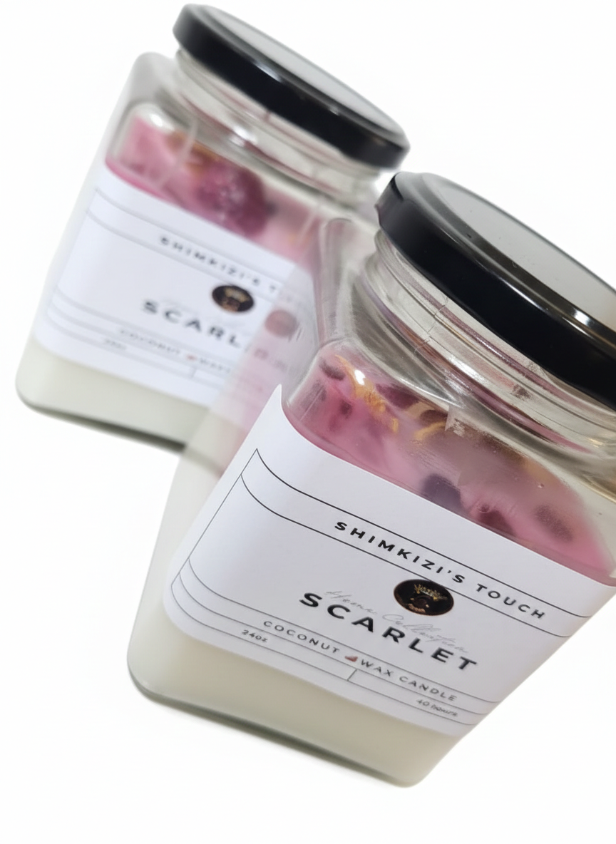 Crafted with a premium blend of 100% natural coconut wax, our Scarlet  fragrance candle offers a sophisticated and sustainable way to elevate your home atmosphere. This 24oz luxury candle is designed to provide a clean, slow burn that fills your space with a captivating aroma—free from the soot and toxins often found in traditional paraffin waxes.